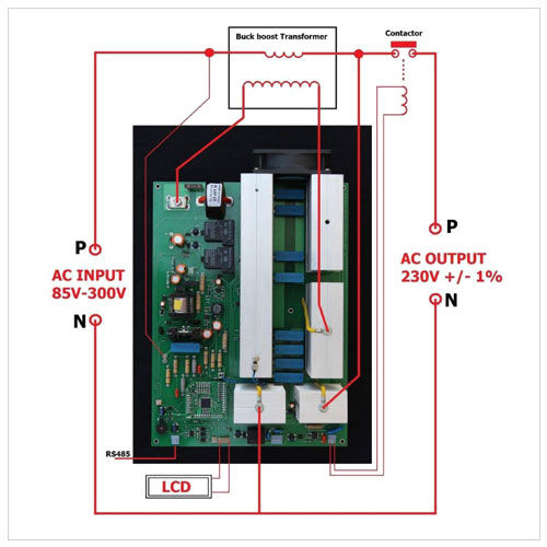 For example - If the AC input is 200V and the AC output is set for 220V, only 20V will be regulated through the IGBT and will be added to the original mains source which is 200V. If the AC input is 195V, then 25V will be added....