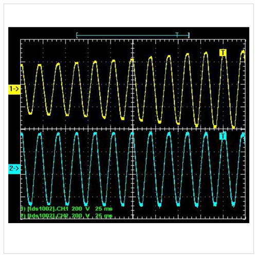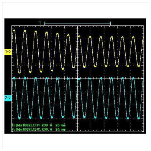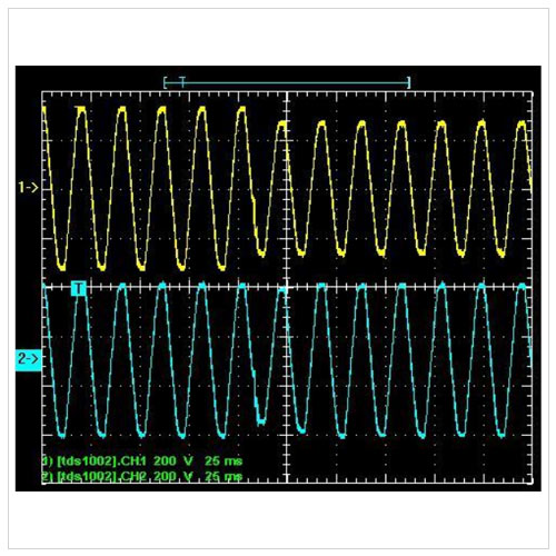 As we can see in the above waveform, input voltage (channel 1 –yellow) is dragged down from high voltage to low voltage within 0.2sec, but the output voltage (channel 2 –blue) remains steady.
